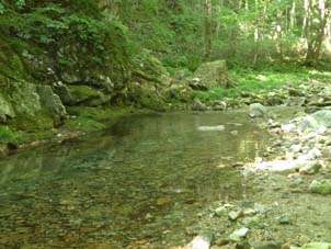 | やっとイワナが釣れた。 | しかし、暑い。日影を探して河原を移動する。 |