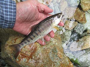 | 深みからすうっと上がってきて毛針を加えたイワナ。 | なかなかいい型のイワナだった。嬉しい。 |