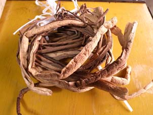芋がらの乾燥したもの。これをお湯で戻して料理に使う。