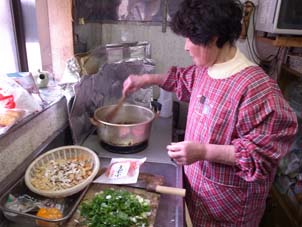 変わってヒデ子さんの動きが急になる。手早く急いで全体をかき混ぜる。鍋がゴトゴト動