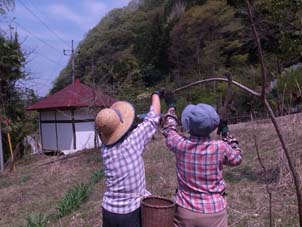 タラの芽を採る道代さんと原島さん。伸びた葉も天ぷらに出来る。