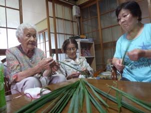 坂本ミサヲさん(八十九歳)で、昔の話を聞きながら自宅前の畑で採れたモロヘイヤを使