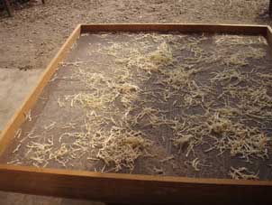 を除いた蕎麦の実は四日ほど天日で乾燥させる。干す時は特注して作ったステンレスの網