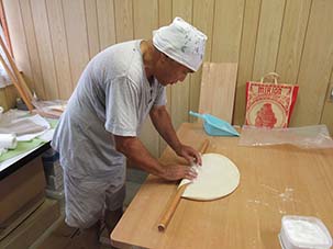 次は作業台に打ち粉を振って、麺棒で平らに伸ばす作業に入る。勇さんの動きはよどみ