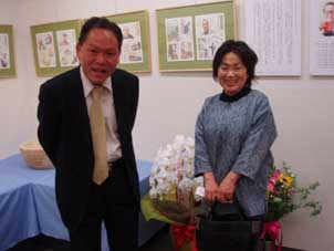 | 入り口で記念写真。今回はNHKで放送したビデオも流しました。 | 口開けの客は新井さん。仕事の途中だそうです。 |